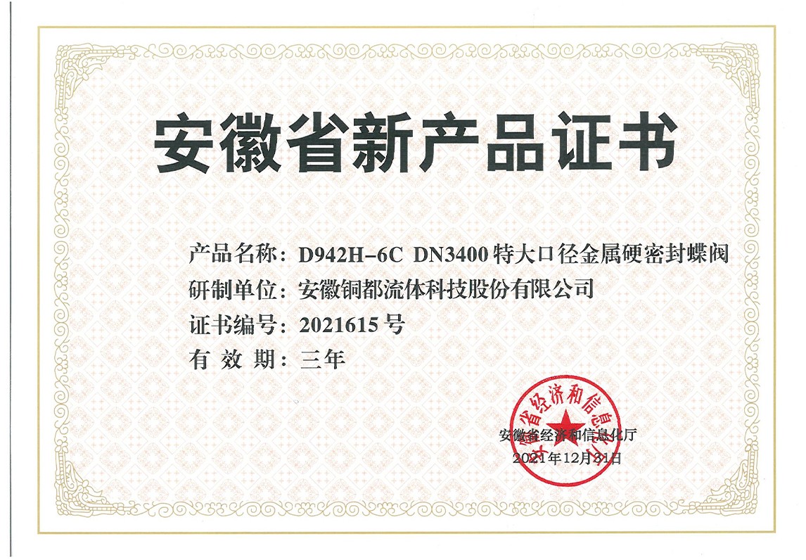 安徽省新產(chǎn)品證書(shū)-硬密封蝶閥