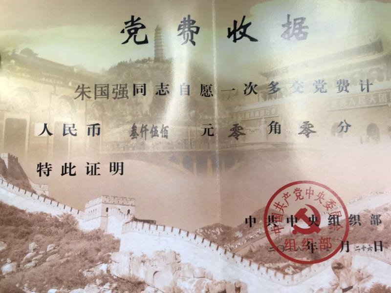 公司鉚焊車間員工、共產(chǎn)黨員朱國(guó)強(qiáng)同志,主動(dòng)將自己獲得"銅陵好人"榮譽(yù)的獎(jiǎng)勵(lì)金3500元,作為特殊黨費(fèi)上交,受到中央組織部的充分肯定和贊揚(yáng),并頒發(fā)特殊《黨費(fèi)收據(jù)》證書。