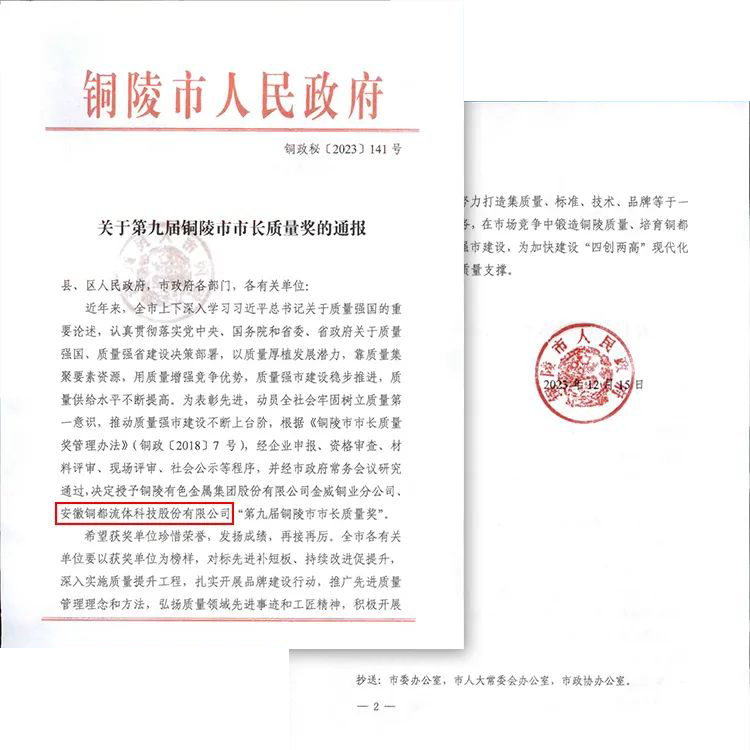日前,安徽銅都流體科技股份有限公司榮獲第九屆銅陵市市長質(zhì)量獎。