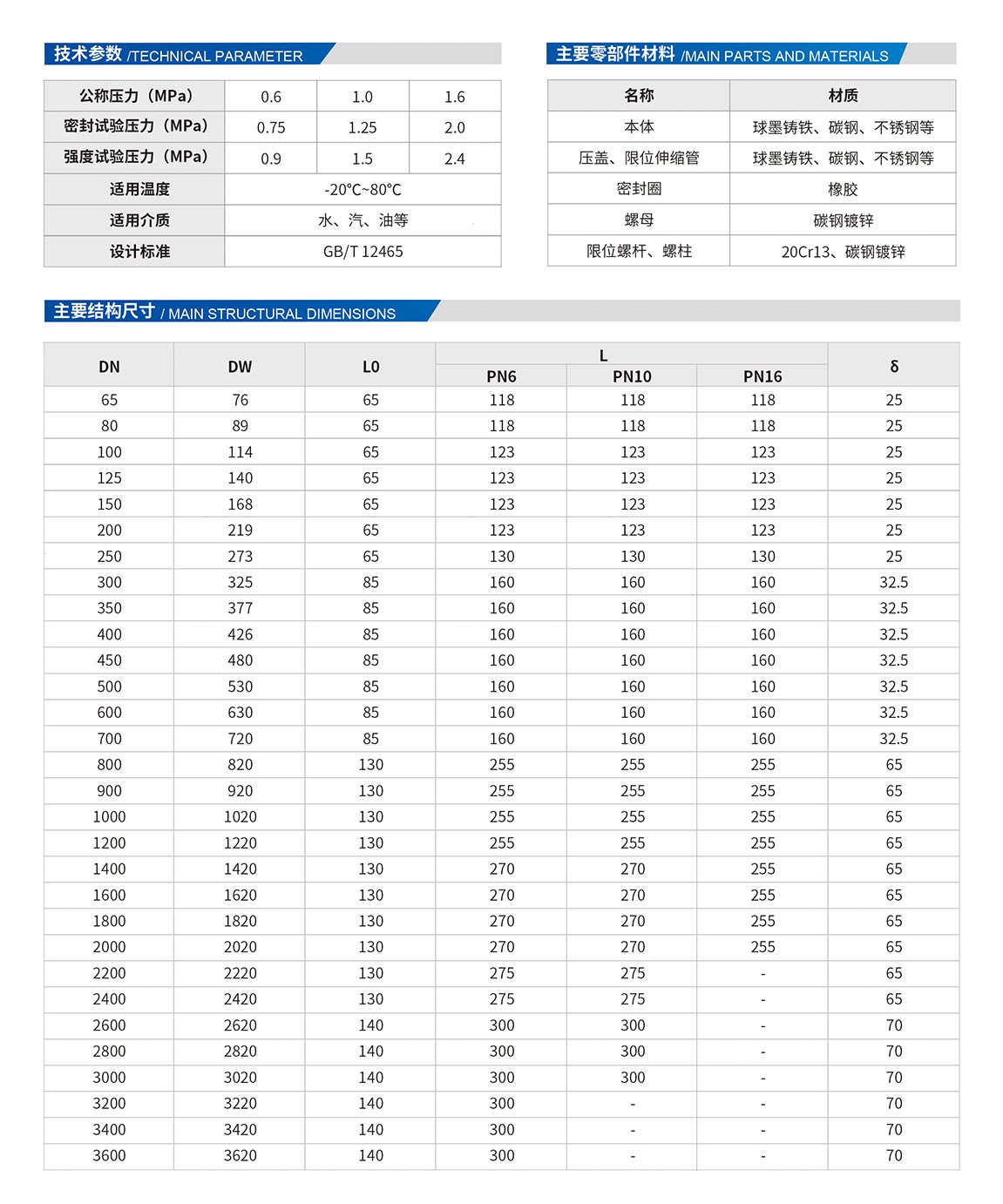 松套限位補(bǔ)償接頭安裝在管道上后,擰緊螺母,起到密封和連接作用。當(dāng)溫度變化時,管子能在接頭中間自由地伸縮,當(dāng)?shù)鼗鲁?、偏斜,它均能確保密封無滲漏,從而達(dá)到自動補(bǔ)償之目的。