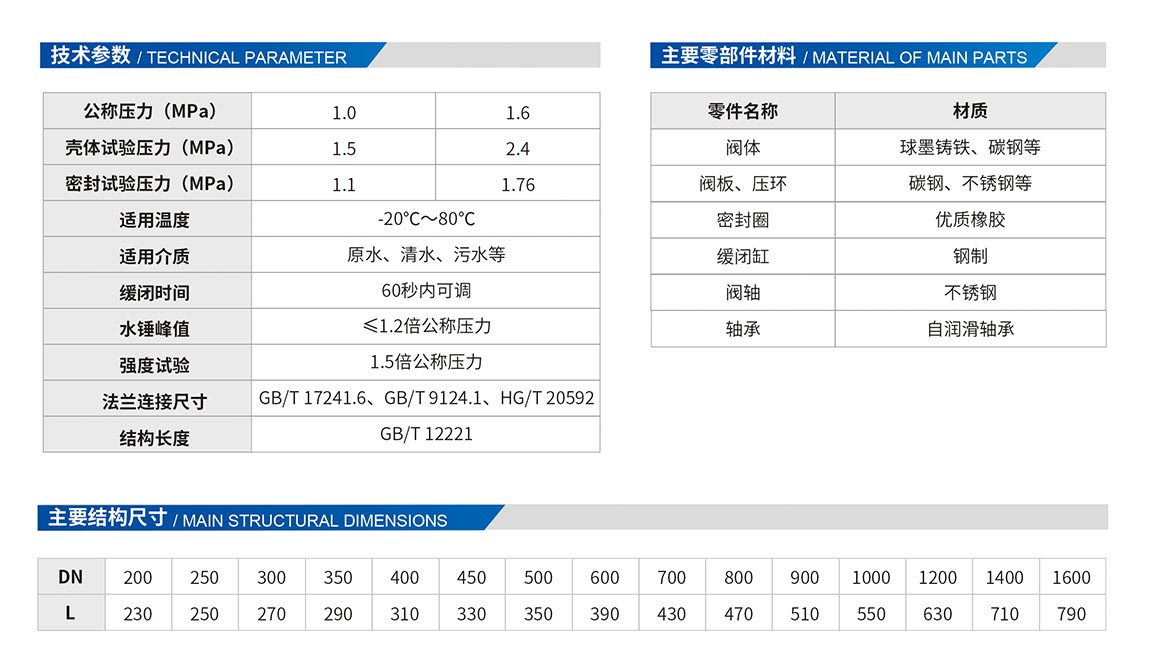 蝶形緩閉止回閥主要用于凈水、原水、污水、海水等介質的供、排水管道上,安裝在水泵出口處,用以截斷介質的回流,消除水錘,保護管道、水泵的安全運行。其主要特點:體形小、重量輕、結構長度只有旋啟式止回閥的三分之一左右。帶外置阻尼油缸,緩閉性能優(yōu)良,不受管道中介質的影響,閥瓣先速關后緩閉,可防止破環(huán)性水錘。橡膠軟密封,結構密封性能好,耐磨損,使用壽命長。橡膠緩沖,運行平穩(wěn),無震動及噪音,比老式止回閥流阻小,有明顯的節(jié)能效果。